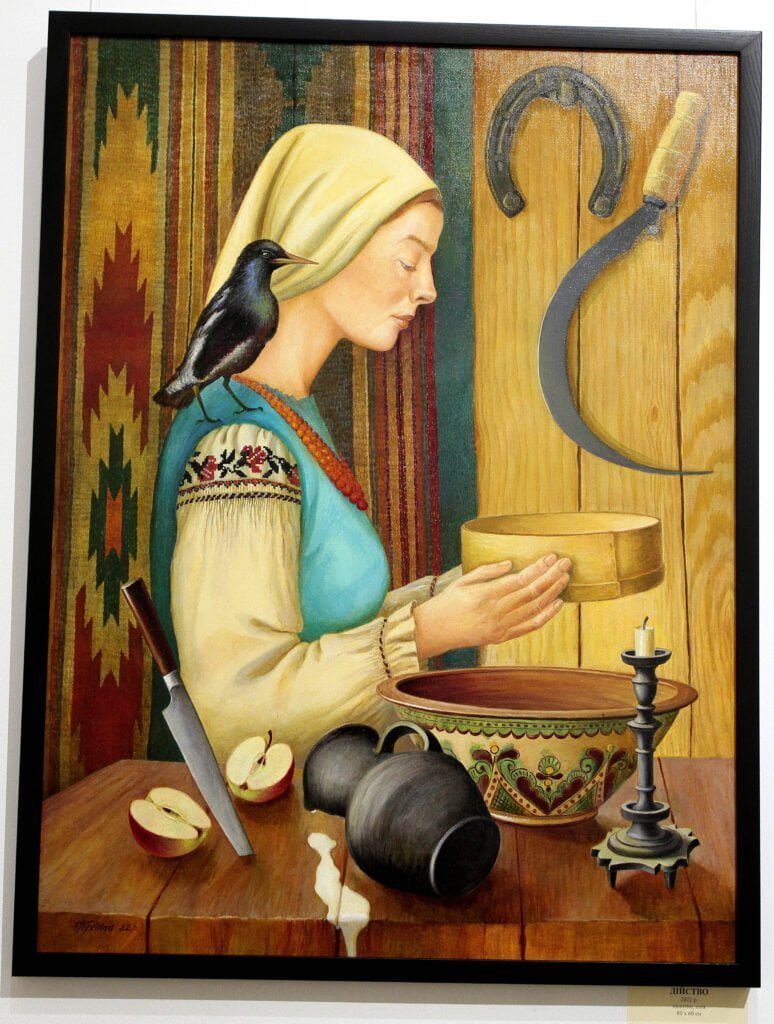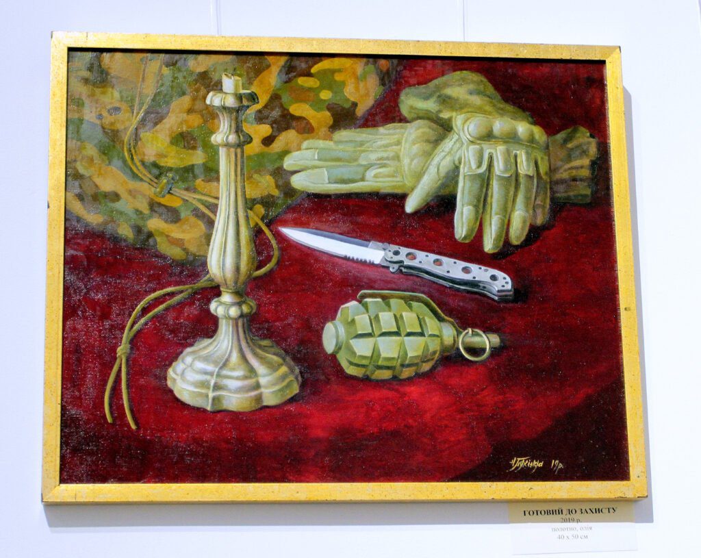 «Це не просто набір речей, вона дуже ретельно продумує композиції, кожна робота має свій смисл і підтекст. Техніка виконання картин вражає. Тут переважно гуцульська тематика, але частина виставки присвячена війні, нашим реаліям. Є дещо сюрреалістичні роботи, є натюрморти, наприклад із рукавицями і гранатою. Для неї ця тема дуже болюча, вона це переживає», – пояснює Марта Волошанська.