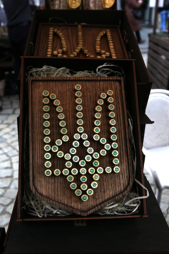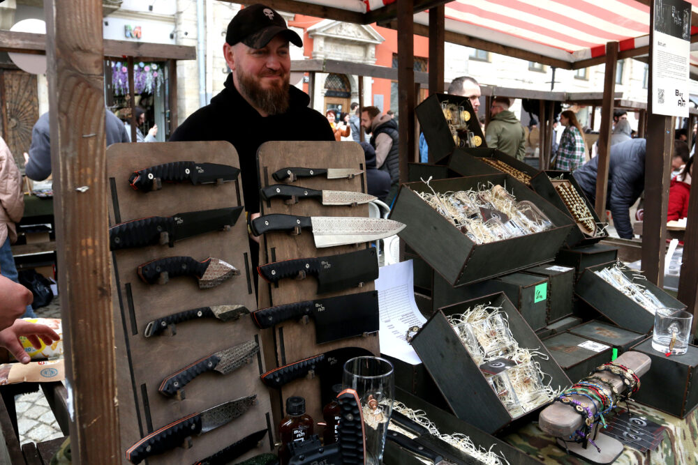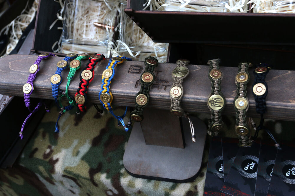 Ще один ветеран з Ірпеня робить браслети з обрізаних гільз, а також гравійовані ножі. Цей бізнес він започаткував, коли ще тривала АТО. Вони на ярмарок привезли багато всього. Ба більше, ще жодного ярмарку не пропустили.