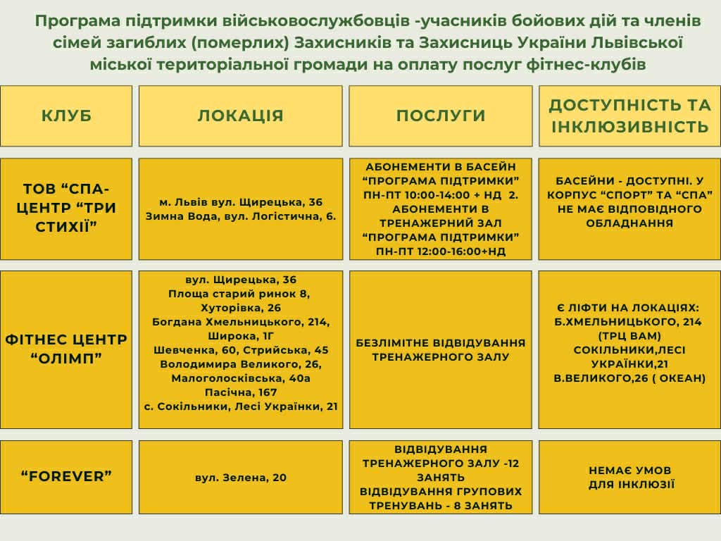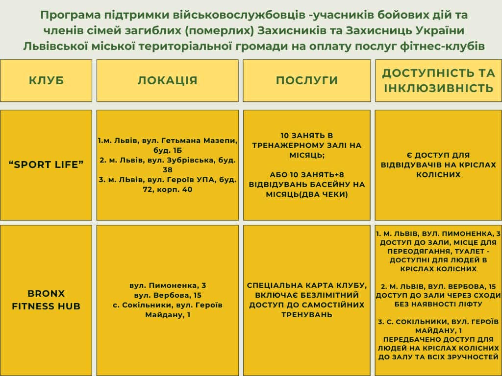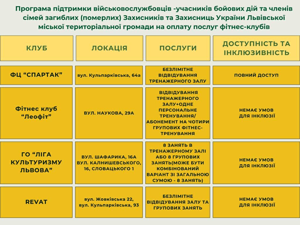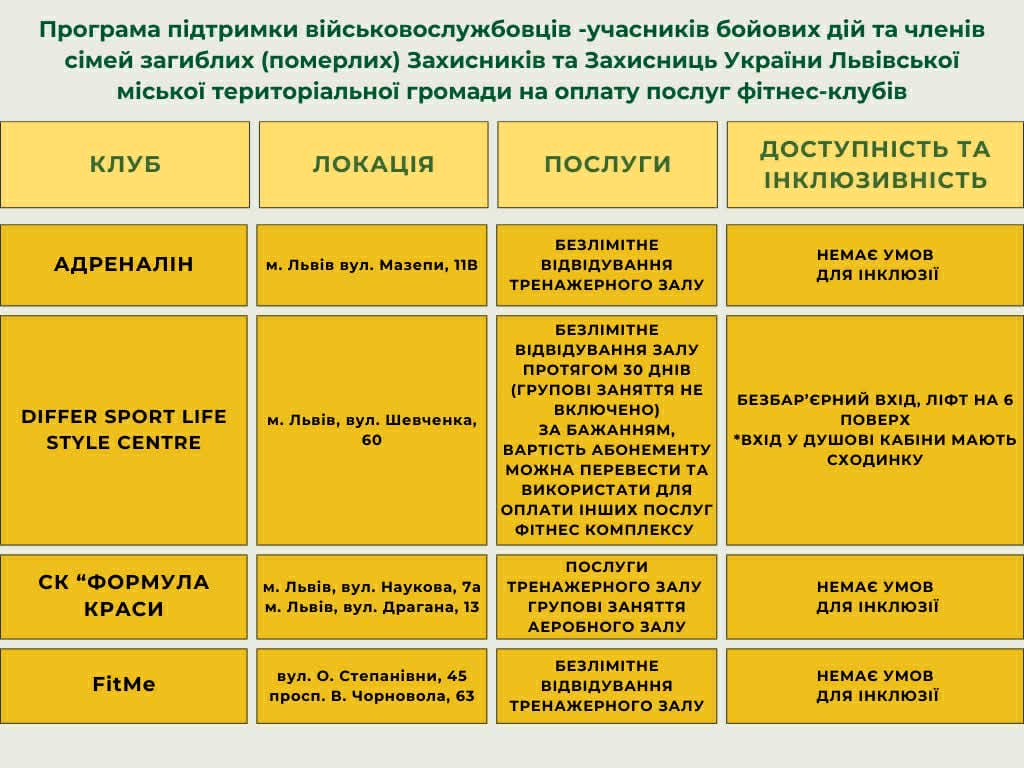 Зазначу, що торік у грудні у Львові розширили програму компенсації занять у фітнес-клубах для родин захисників та захисниць.