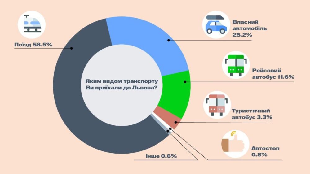Отже, опитування показують, що до Львова 58,5% іноземців їдуть потягом, 25,2% власним авто, 11,6% рейсовим автобусом, 3,3% туристичним автобусом, 0,8% автостопом.