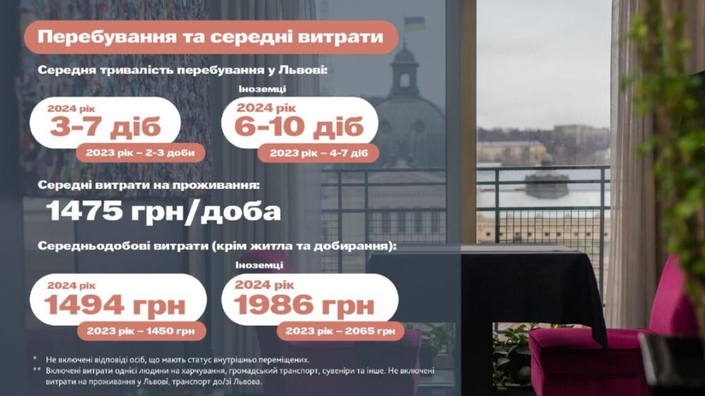 Середня тривалість перебування у Львові іноземців у 2024-му, згідно з опитуванням, збільшилася. Торік іноземці перебували у нас чотири-сім діб, цього року – шість-десять діб. Українці у 2023-му перебували у Львові дві-три доби, у 2024-му – три-сім діб.