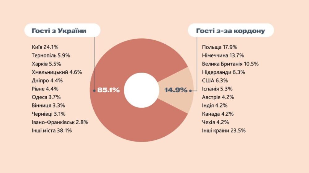 Щодо цифр, то 24,1% – це гості з Києва, 5,9% – Тернополя, 5,5% – Харкова, 4,6% – Хмельницького. Гості з міст Дніпро та Рівне по 4,4%, з Одеси – 3,7%.