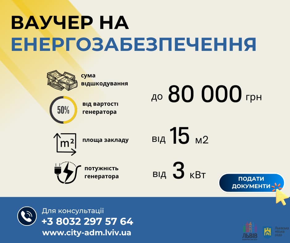 Популярні ваучери на енергозбереження (300 тисяч гривень, конкурс завершився 31 липня) та ваучер на енергозабезпечення (80 тисяч гривень). Місто компенсує 50% витрат.