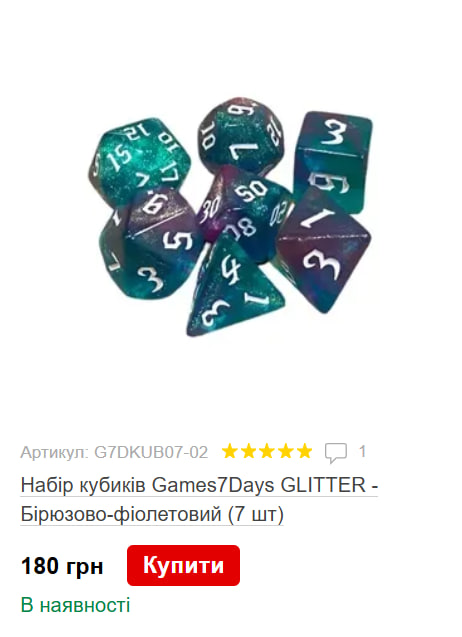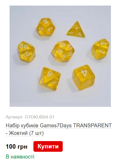 - як мінімум один набір із семи гральних кубів (дайсів) на кожного. Їхній асортимент у магазинах настільних ігор та у крафтерів незліченний. Але оскільки ми початківці, розглянемо дешеві варіанти. Ціна їх варіюється від 100 до 200 грн, тому візьмемо середню – 150. У підсумку маємо 900 грн. Якщо вашій компанії не принципово мати фізичні куби, можна скористатися безплатними додатками, як-от RPG Simple Dice;