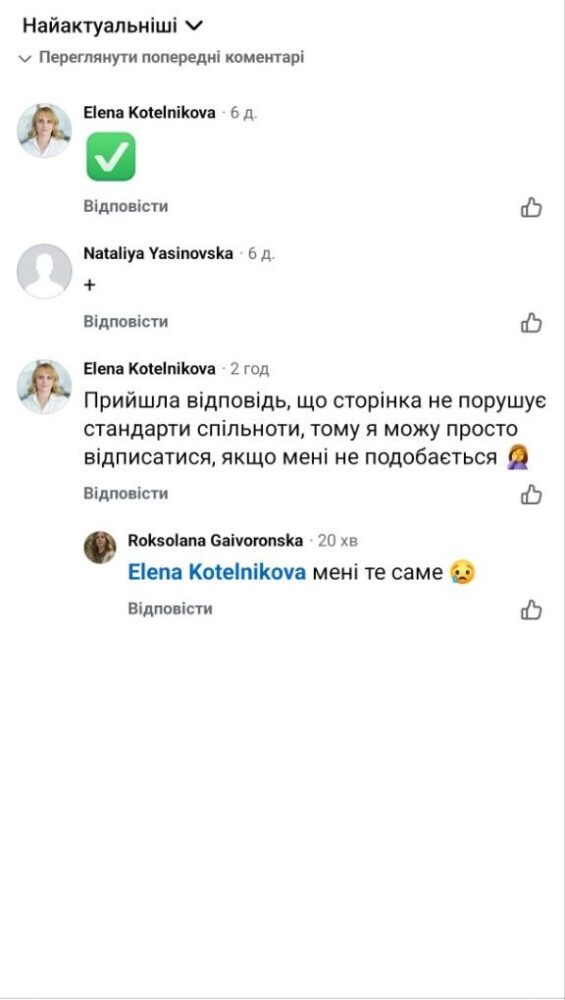 «Мені надіслали повідомлення про блокування акаунтів через сексуальну експлуатацію дітей. Й моє портретне фото також потрапило під це обмеження. Цікаво, що через цю скаргу блокування застосували буквально миттєво. Водночас мої підписники скаржаться на дії теперішнього адміністратора «Давай займемося текстом», але фейсбук цього не бачить», – розповідає жінка.