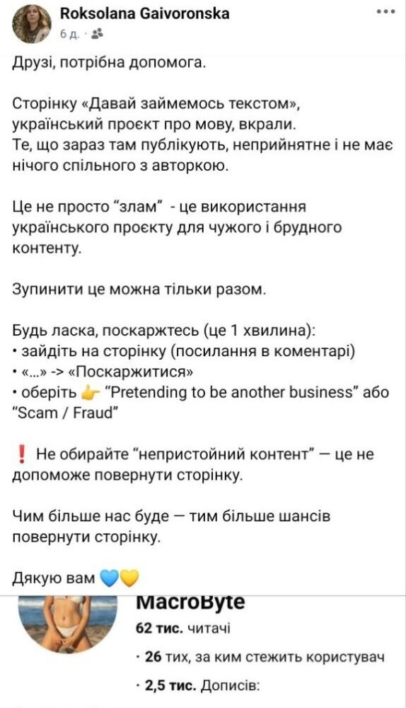 Іронічно, але викрадення фейсбук-сторінки «Давай займемось текстом» трапилося у День письменника – 3 березня. За кілька днів до цього Наталя подала у Meta запит на синю «пташечку» як доказ справжності акаунту у соцмережах. Через деякий час на електронну скриньку – що цікаво, не у папку «Спам» – надійшло повідомлення про підтвердження прохання, проте залишилося заповнити форму. «Вона була подібна на ті, що часто заповнюю, подаючись на різні гранти або конкурси. До того ж про мій намір ніхто не знав. Тож мені навіть на думку не спало, що це може виявитися шахрайською схемою», – каже авторка проєкту.