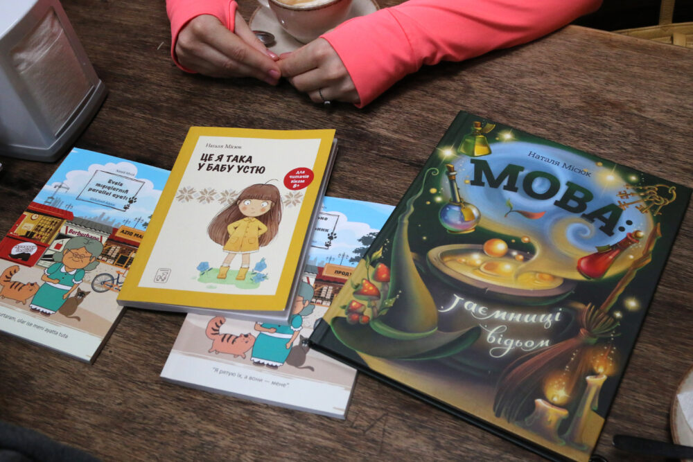 Наталя Місюк, письменниця, засновниця проєкту «Давай займемось текстом» й популяризаторка української мови, принесла на зустріч свої книги. Тут і розповіді про життя в Криму, бабусю, родинні архівні світлини, фентезійні персонажі якої розповідають читачам, як перейти на українську мову.
