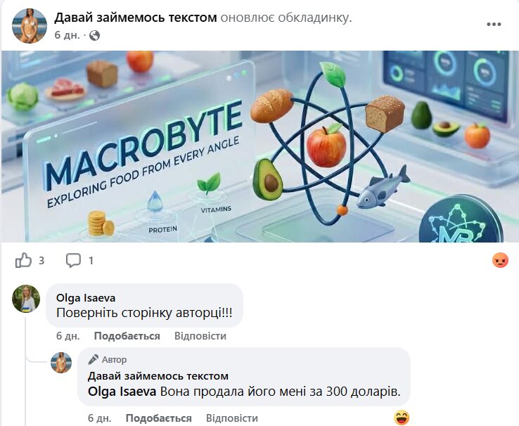 В той момент, веде далі Наталя, вона зрозуміла, що більше не є адміністратором сторінки «Давай займемось текстом», натомість там «господарює» дівчина з Китаю. Але за цим образом може ховатися будь-хто. Найсмішніше, що цей «хтось» написав, що купив сторінку за 300 доларів.