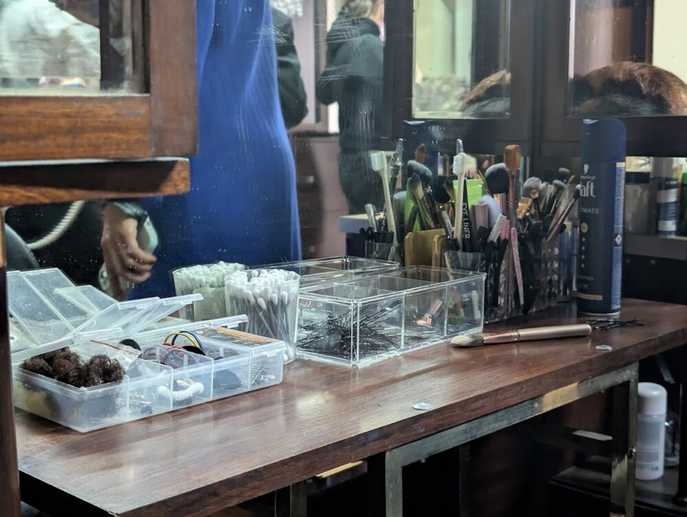 Далі йдемо до цеху, де виготовляють перуки для постановок. Дзеркала, столики, на яких лежать гребінці, шпильки, стоять баночки з лаком для волосся, роблять ці дві суміжні кімнати схожими на салон краси.