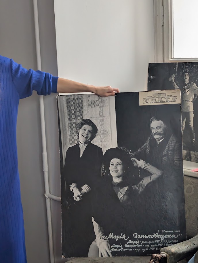 В куточку сховалась давня афіша до вистави «Марія Заньковецька». Цього року заньківчани готують прем’єру нової постановки про патронесу. Тетяна показує нам фото з тої вистави, де головну роль зіграла Лариса Кадирова: «Ця постановка про театральних корифеїв. Її текст цензурували, забороняли, бо для тодішньої влади було незручним саме існування власне українського театру».