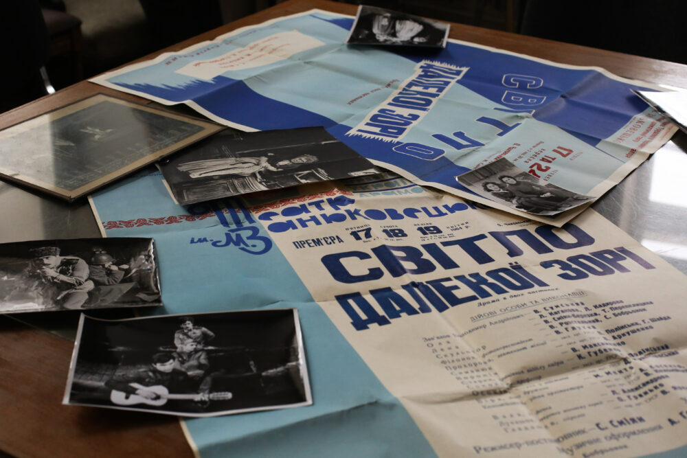 Поки ми чекали відкриття костюмерної, зазирнули до кабінету Федора Стригуна, колишнього головного режисера театру Заньковецької. З вікон цієї кімнати чудовий краєвид на оперний. На столі у центрі бачу старі афіші й фото з вистав. Тетяна зауважує, що це нагадування про новий виток історії театру – 1970-ті роки, коли головним режисером був Сергій Данченко, а актори Богдан Ступка й Анатолій Хостікоєв грали в його постановках.