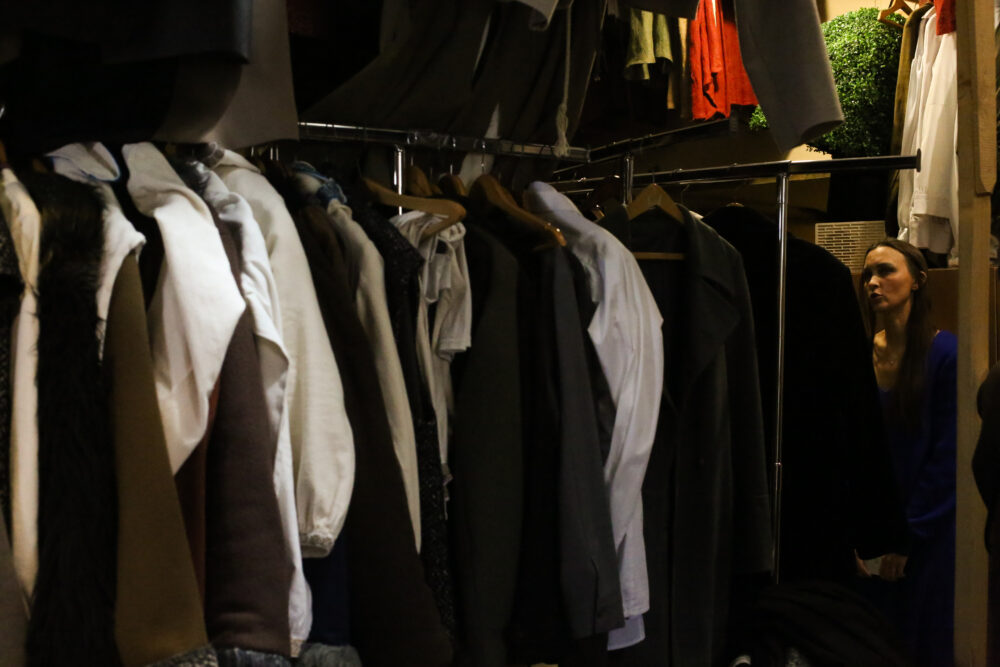Та найбільше нас усіх вабила костюмерна. Ця кімната буквально завішана різним одягом й заставлена взуттєвими коробками. Проте працівники точно знають, де знайти той чи той костюм. До прикладу, нам миттєво знайшли і показали проколоте шпагами вбрання з вистави «Сірано де Бержерак». Чоловічі та жіночі одежі шиють у різних цехах. Деякі речі можуть купувати, як це зробили для «Червоної рути». Проте штани для цієї постановки таки довелося шити, бо її дія розгортається в 1970-ті – еру кльошу.