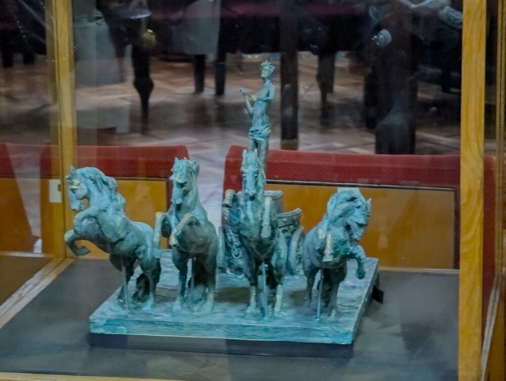 Виходячи з кабінету, в коридорі за склом зауважую невелику копію колісниці, яка з самого відкриття прикрашала будівлю театру. Але їй не судилося довго простояти на його вершині. Досить швидко вітер зірвав з даху дерев’яну скульптуру. Можливо, її колись відновлять у повному розмірі й встановлять туди, де вона мала б бути увесь цей час.