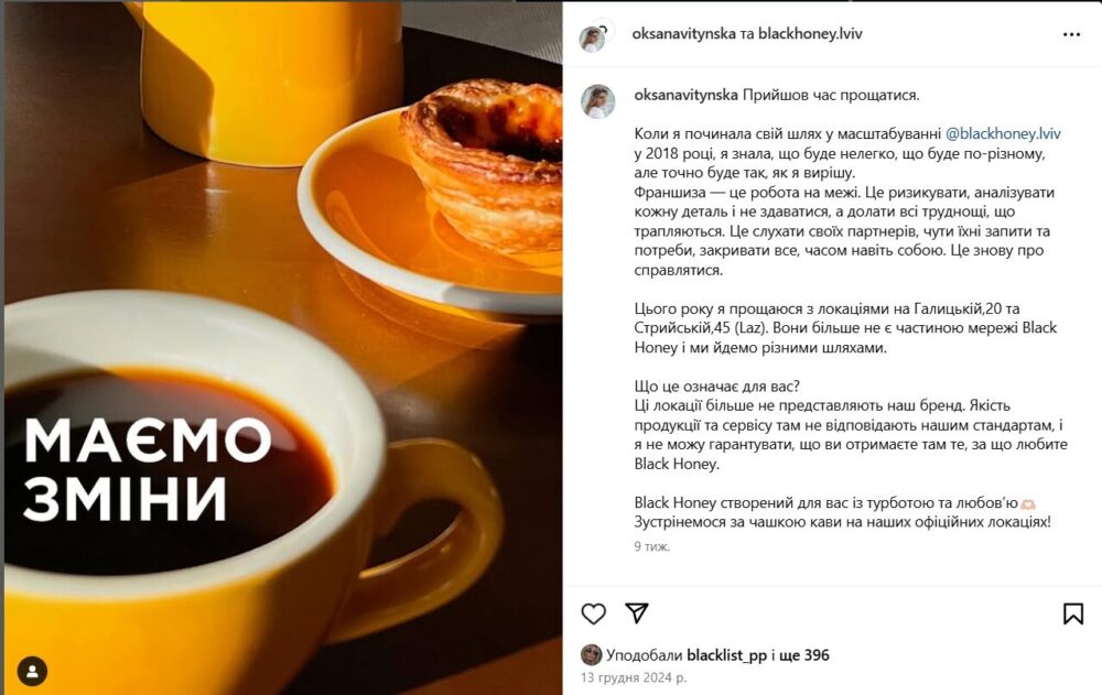 “Цього року я прощаюся з локаціями на Галицькій, 20 та Стрийській, 45 (Laz). Вони більше не є частиною мережі Black Honey, і ми йдемо різними шляхами. Що це означає для вас? Ці локації більше не представляють наш бренд. Якість продукції та сервісу там не відповідають нашим стандартам, і я не можу гарантувати, що ви отримаєте там те, за що любите Black Honey”.