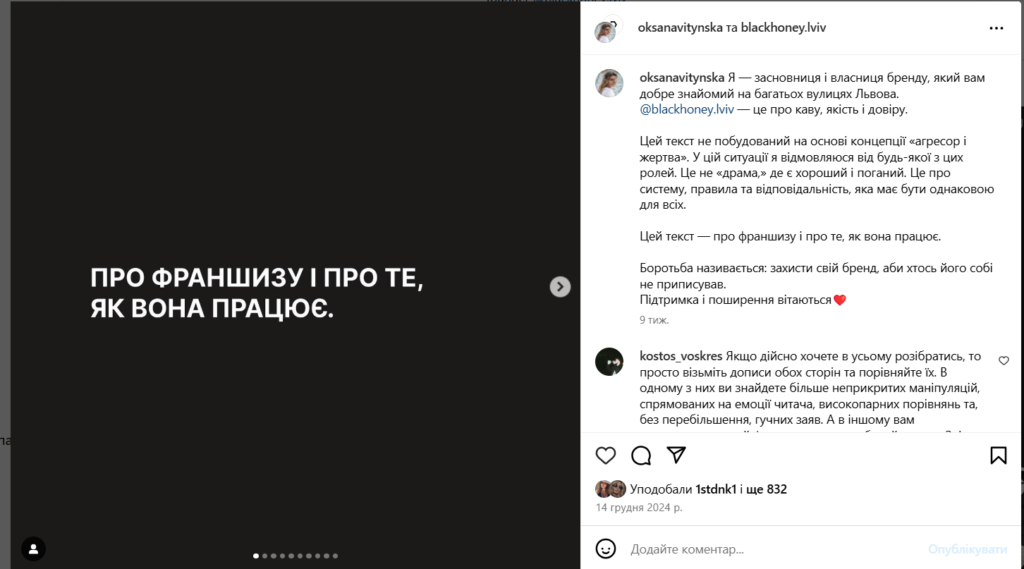 Наступного дня, 14 грудня, вона опублікувала ще один допис із поясненням, що причина конфлікту – порушення франчайзі договірних зобов’язань: