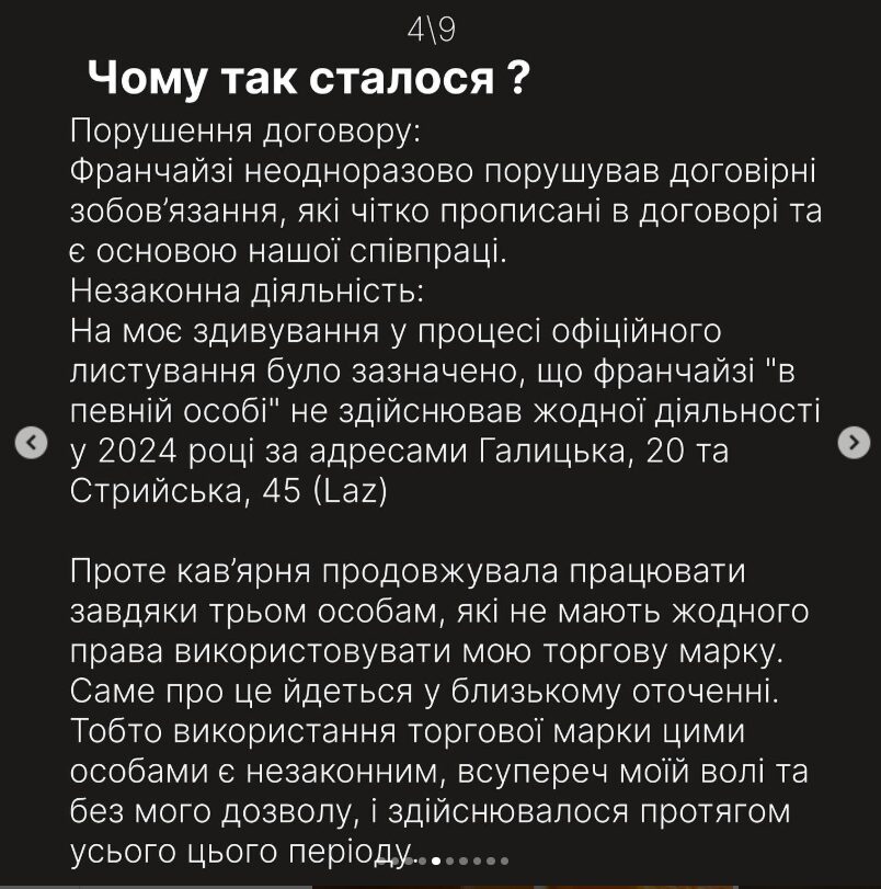 Також він заявляє, що його безпідставно звинувачують у незаконній діяльності, хоча всі процеси узгоджувалися з власницею бренду. Кульмінацією стало те, що йому запропонували передати кав’ярню на Галицькій в обмін на припинення претензій.