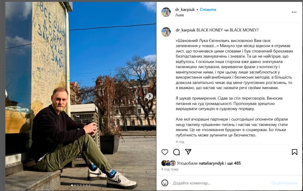 “Особливим кричущим фактом зневаги до ветеранського середовища, я вважаю, є факт продовження позиціонування Black Honey як соціально відповідального повʼязаного з військовослужбовцем бренду, який надає особливу допомогу війську і підтримку ветеранам. Якщо намагання викинути чинного військовослужбовця з його бізнесу, поки він перебуває в зоні виконання, є тими самими принципами поваги і підтримки, то я скажу, що це повне божевілля. А водночас компанія продовжує працювати над залученням приватних і державних ґрантів”, – написав Карпюк у публікації.
