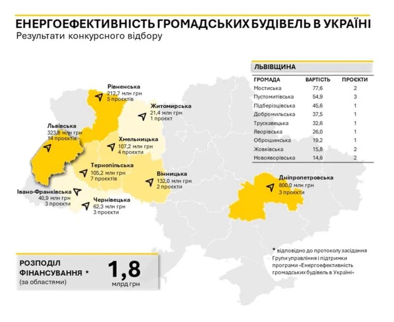 Загалом по Україні підтримали 42 проєкти на суму понад 1,8 млрд гривень, з яких 323,8 млн грн для проєктів на Львівщині.