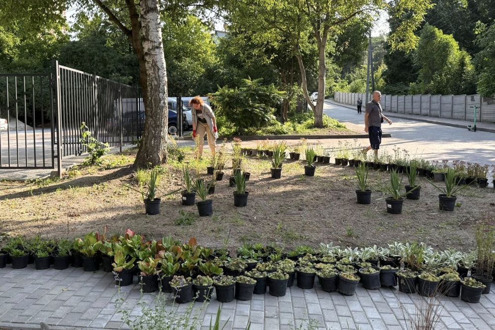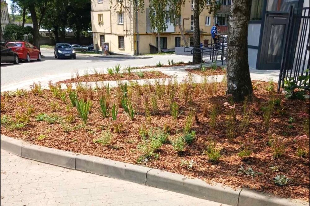 Перед будівлею нічного притулку Центру соціальних послуг «Джерело» на вул. Кирилівській, 3А створили новий громадський простір. Тут висадили юки, кизильники, деревій, очиток, айстри, бадани, осоки та інші багаторічні рослини.