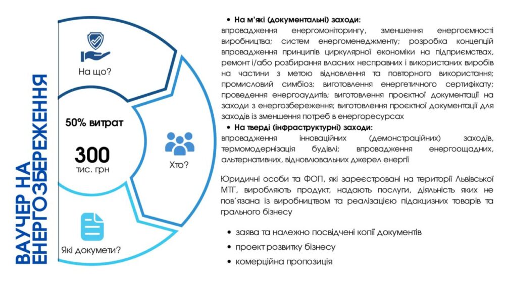 Підприємці Львівської міської територіальної громади можуть отримати компенсацію на впровадження енергозберігаючих ініціатив. У рамках ваучерної підтримки бізнесу до 31 липня триває конкурс на отримання ваучера на енергозбереження. Про це «Львівській Пошті» повідомила керівниця департаменту економічного розвитку Львівської міської ради Інна Свистун.