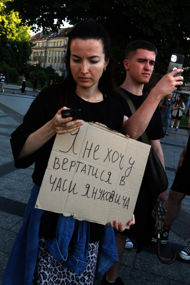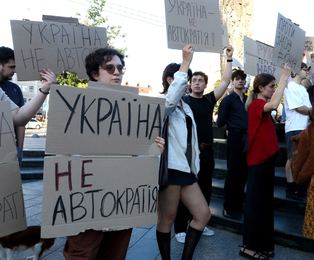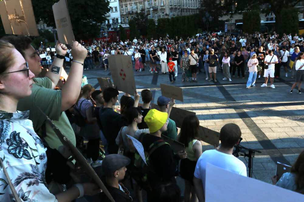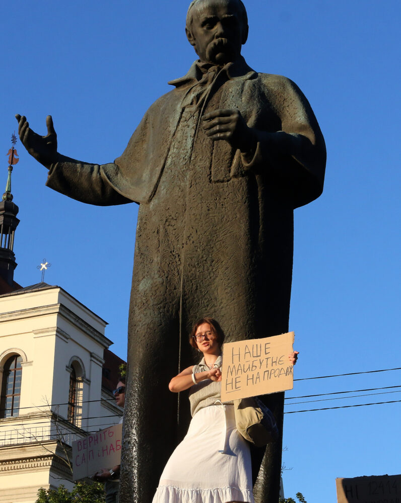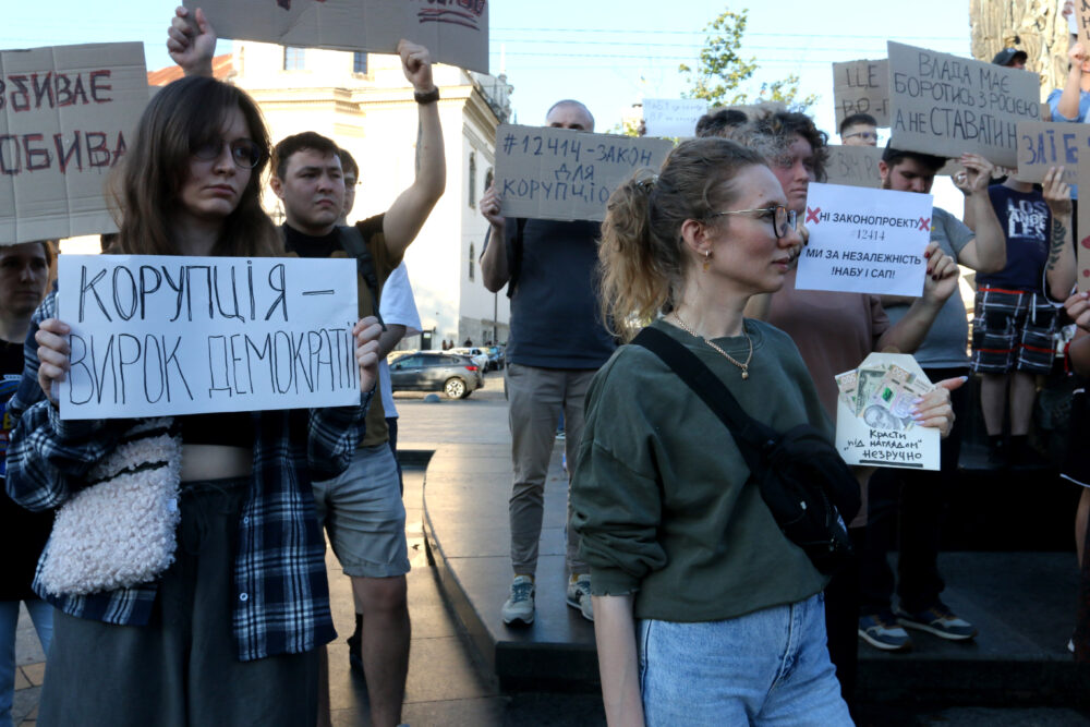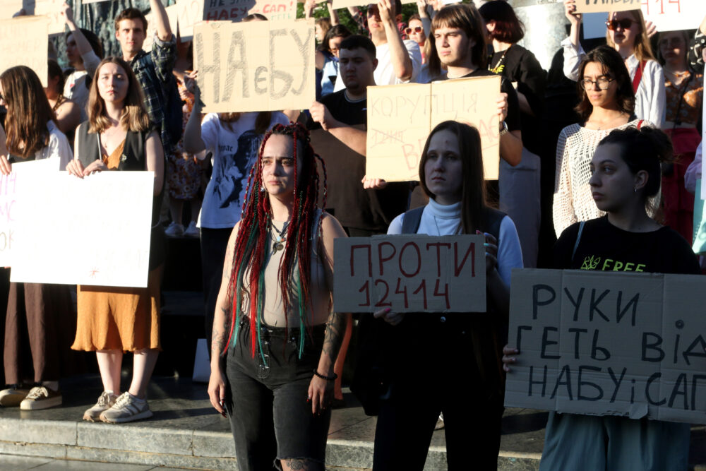 На площі біля пам’ятника Шевченку відбувся мітинг проти підтриманого Верховною Радою законопроєкту №12414, згідно з яким Національне антикорупційне бюро України (НАБУ) та Спеціалізована антикорупційна прокуратура (САП) підпорядковуватимуться Офісу генпрокурора.