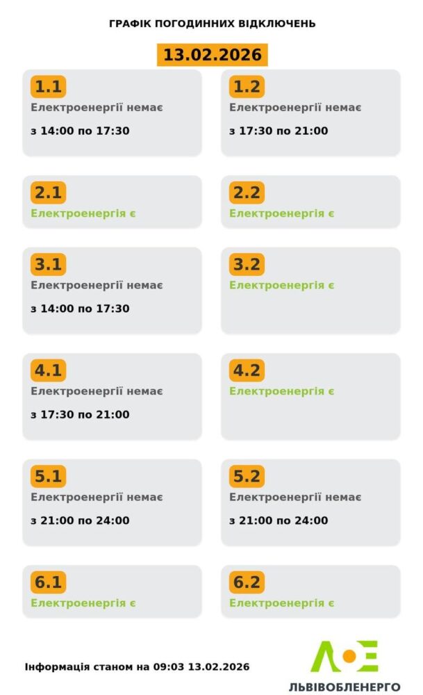 Львівобленерго оприлюднило графік погодинних відключень для Львова та Львівщини на 13 лютого. Деякі групи будуть зі світлом протягом всієї доби.