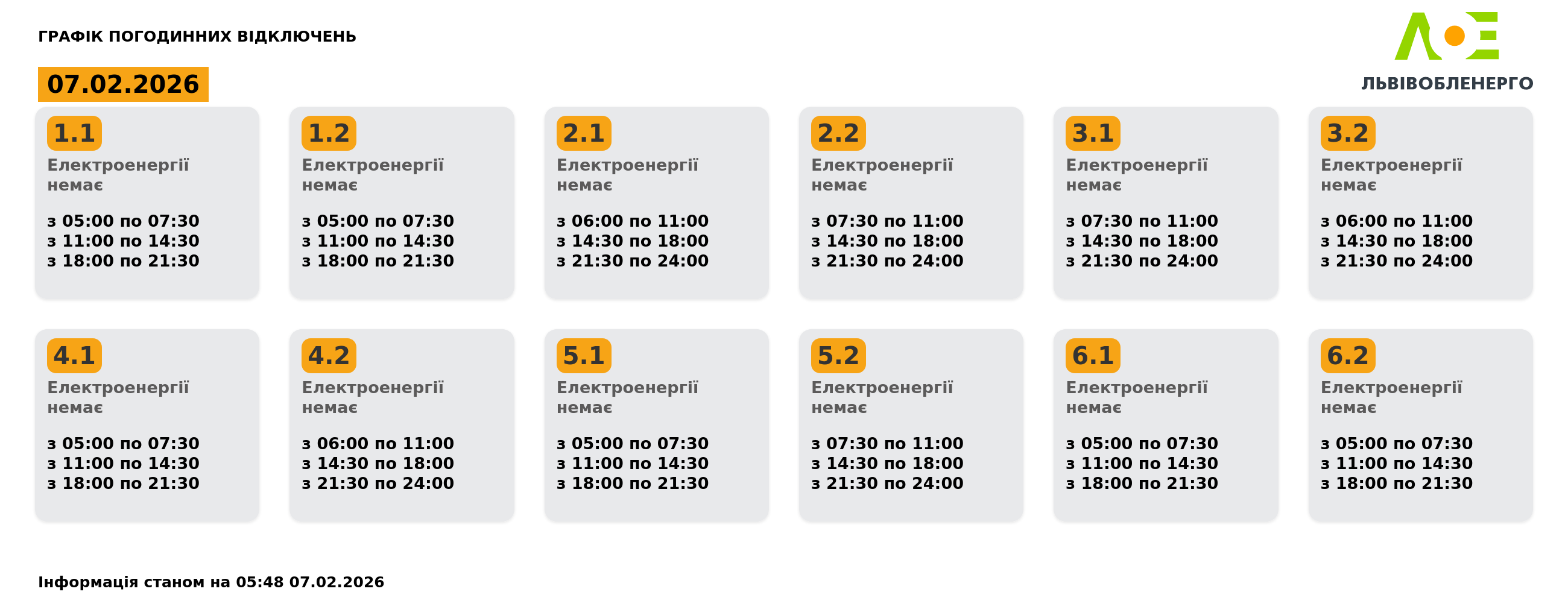 Сьогодні, 7 лютого, у Львові та області діятимуть графіки погодинних знеструмлень. До кінця доби усі групи користувачів матимуть погодинне відключення світла, повідомили у Львівобленерго.