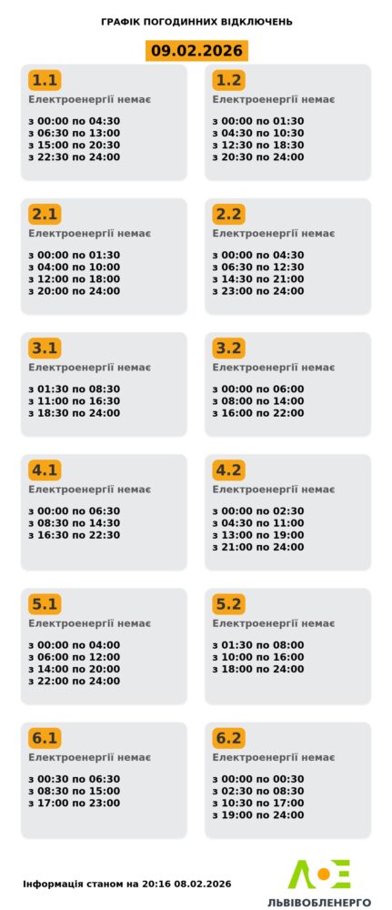 Завтра, 9 лютого, в Україні, у Львові та області зокрема, застосовуватимуть графіки погодинних знеструмлень. Причина — наслідки російських комбінованих атак на енергосистему, повідомили у НЕК «Укренерго».