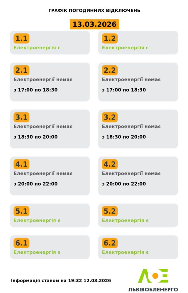 У п’ятницю, 13 березня, у Львові та області діятимуть графіки погодинних знеструмлень. Згідно з розпорядженням НЕК «Укренерго», відключення електроенергії запровадять з 17:00 до 22:00.