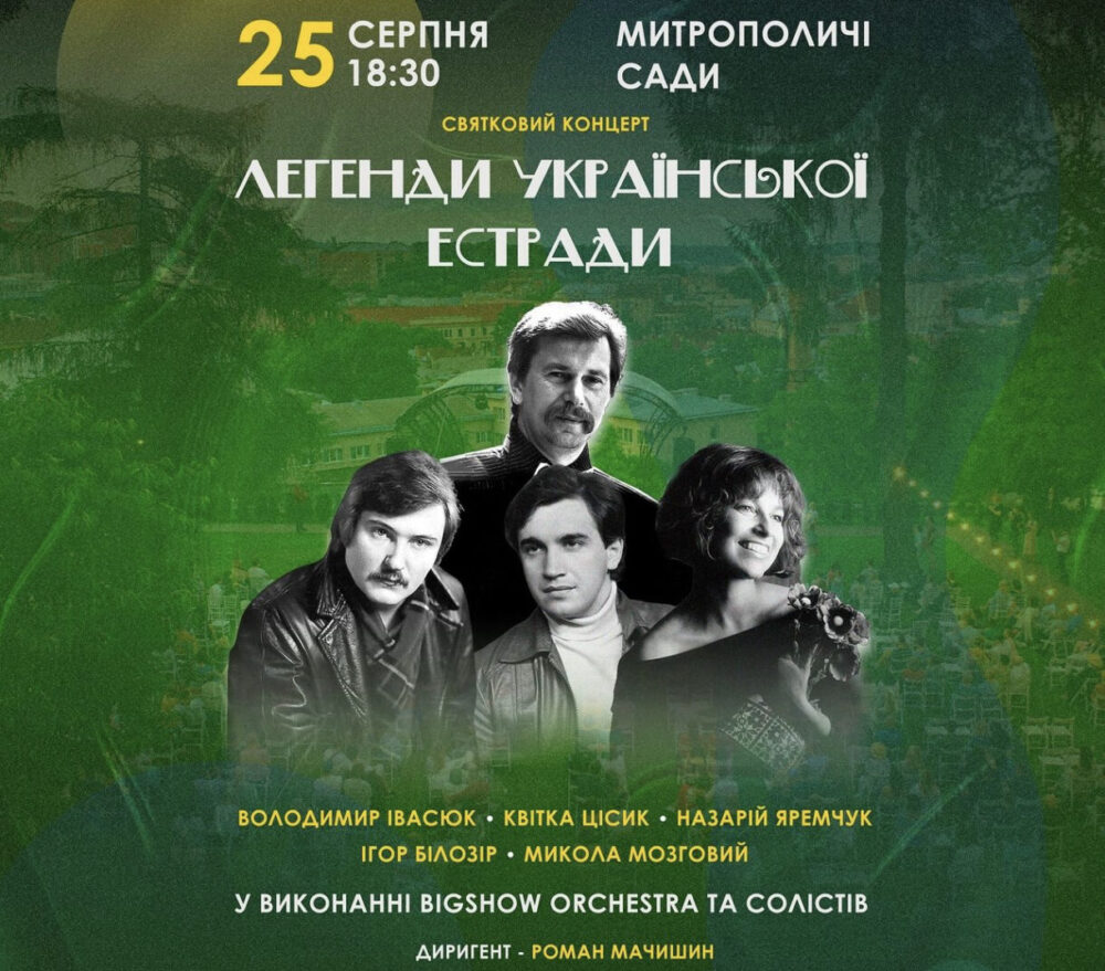 Святковий концерт до Дня Незалежності України від BIGSHOW ORCHESTRA. Особлива програма, в яку ввійшли знакові композиції української естрадної музики. У виконанні оркестру, солістів та за участю рок-бенду звучатить неповторні хіти Володимира Івасюка, Квітки Цісик, Назарія Яремчука, Миколи Мозгового, Ігора Білозіра, Тараса Петриненка та інших.
