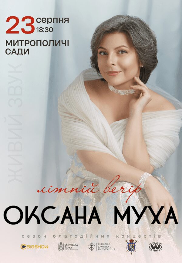 Виступ неповторної Оксани Мухи – заслужена артистка України, володарка золотого голосу продовжує дарувати свою щиру й чуттєву творчість слухачам. На концерті прозвучать як ваші улюблені композиції, так і зовсім нові авторські пісні.
