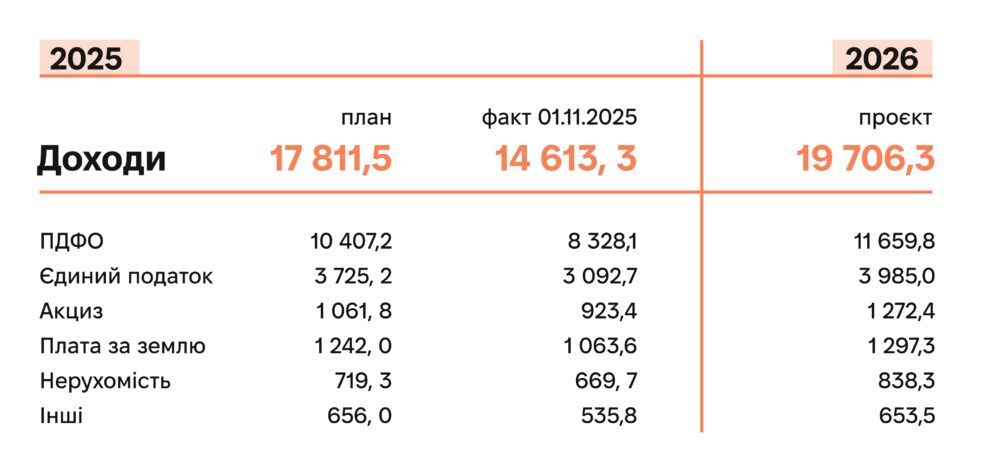Як і минулого року, левову частку надходжень до бюджету становить податок на дохід фізичних осіб (ПДФО). Проте його питома вага у бюджеті трохи знизилася – з 64% у 2025-му до 59,2% у 2026 році (понад 11,6 млрд грн).