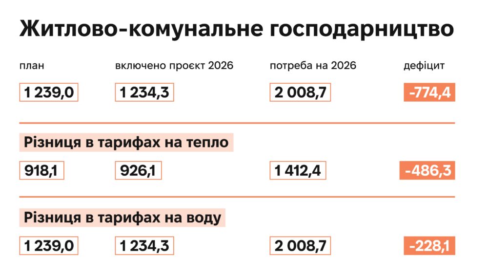 Місто потребує понад 2 млрд грн видатків на житлово-комунальне господарство, але в цьогорічний бюджет на це закладені тільки понад 1,2 млрд грн. Отже, виникає дефіцит на понад 770 млн грн через різницю в тарифах, зокрема: