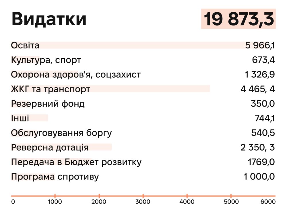Видатки бюджету цього року повністю збігаються з доходами – понад 19,8 млрд грн. Зокрема, гроші виділили на: