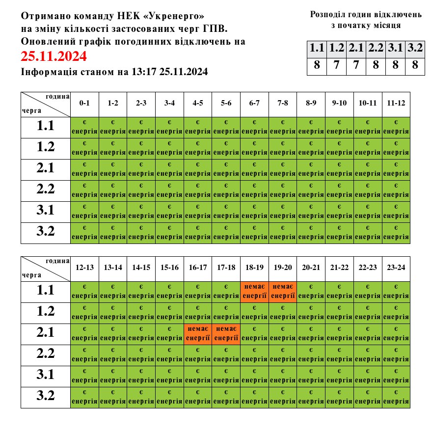 За розпорядженням НЕК «Укренерго» графіки відключень на сьогодні змінено, повідомляє Львівобленерго. Станом на 13:17 25 листопада черги знеструмлень застосовуватимуть з 16:00 до 20:00.
