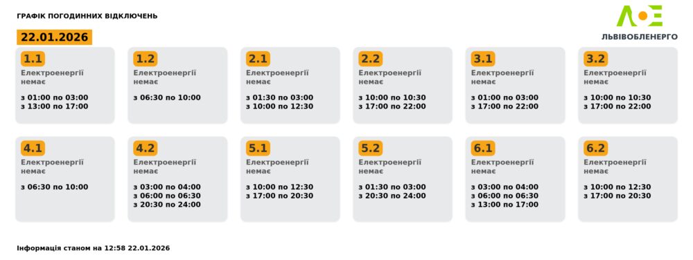 За розпорядженням НЕК «Укренерго» на Львівщині діють графіки погодинних знеструмлень. Львівобленерго опублікувало оновлення на 22 січня.