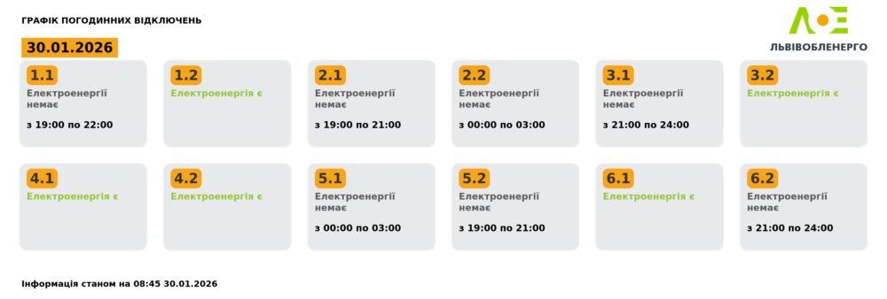 Львівобленерго опублікувало актуальний графік погодинних знеструмлень на 30 січня. Деякі групи споживачів будуть зі світлом.