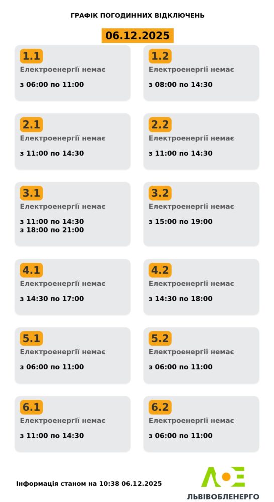 Станом на 10:38 у Львові та області діє оновлений графік погодинних знеструмлень, повідомили у Львівобленерго.