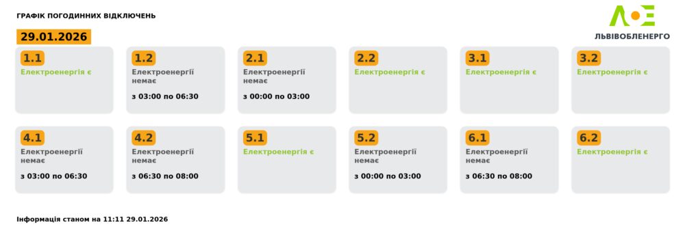 Львівобленерго опублікувало новий графік погодинних знеструмлень. До кінця доби усі групи споживачів будуть зі світлом.