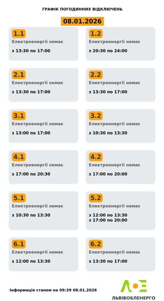 У Львівобленерго оновили графік погодинних відключень на 8 січня.
