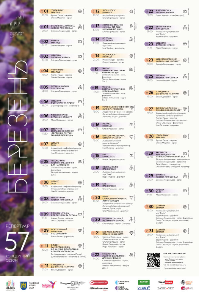 А також багато концертів при свічках, «Пори року» Вівальді та «Лірична музика для скрипки та органа» (виконують Руслан Пащак, Олена Мацелюх, Адріан Боднар, Ольга Стрілецька).