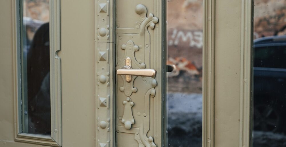 Під шарами фарби реставратори виявили латунні декоративні елементи: збережені деталі очистили й відновили, а втрачені — відлили заново за історичними зразками. Також відновили первісне засклення, встановили нову латунну клямку, відреставрували шпінгалети, змонтували дотягувач і замок.
