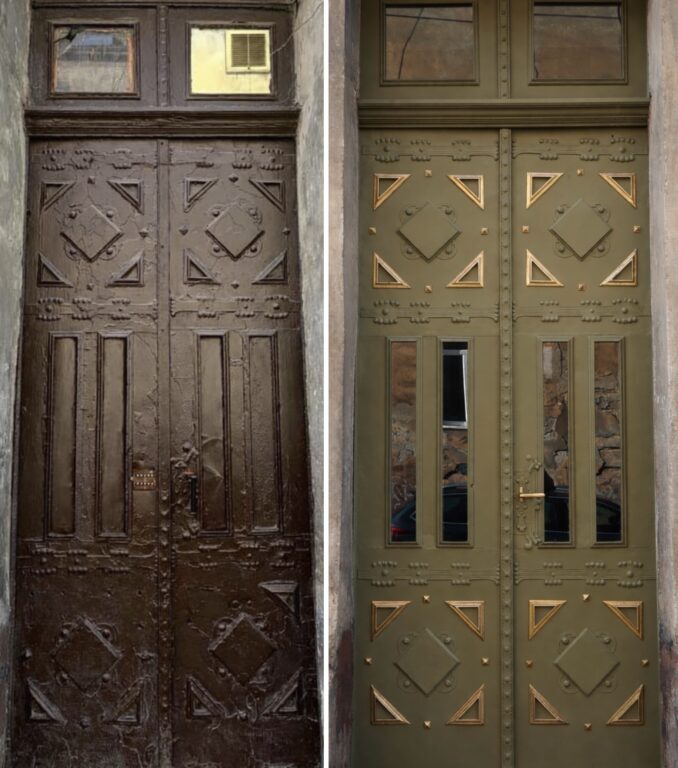 Також у процесі розчищення з’ясувалося, що нижня частина дверної коробки повністю зруйнована корозією та перебувала в аварійному стані. Її демонтували та замінили, так само як і нижню частину дверних полотен.