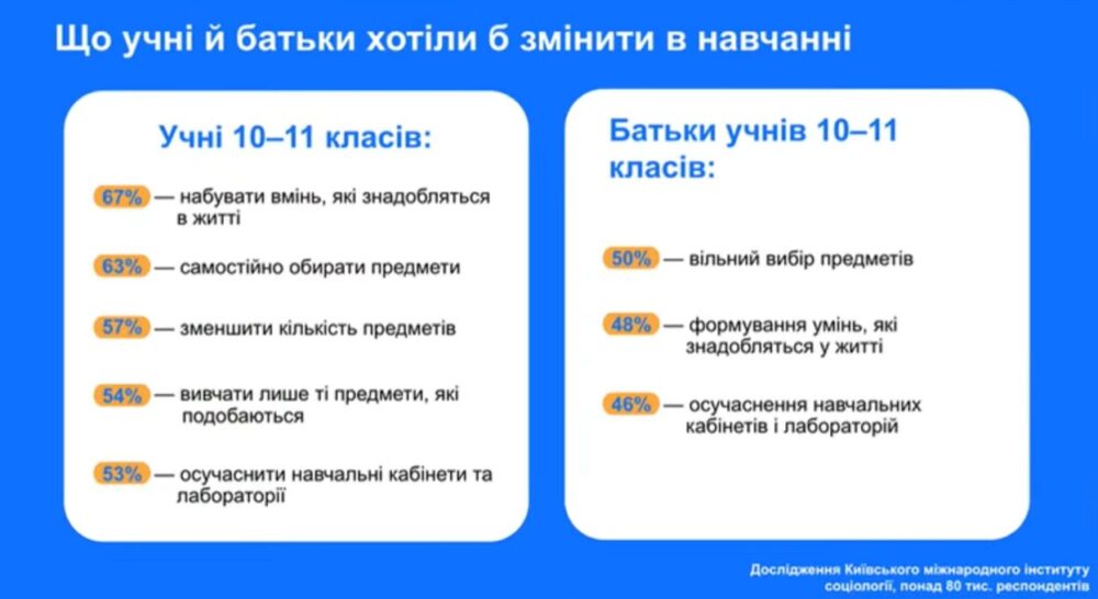 Водночас керівник Офісу впровадження НУШ каже, що на замовлення Міносвіти Київський міжнародний інститут соціології провів дослідження щодо змін у навчанні. У ньому взяли участь понад 80 тис. респондентів — учні 10 — 11 класів та їхні батьки.