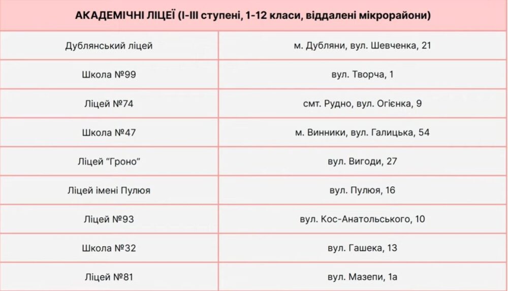 Список навчальних закладів, як зазначив Андрій Закалюк, де буде складна логістика. Зокрема, школа у Дублянах має свої автобуси. У цю школу їхатимуть діти з Великих Грибовичів та Зашкова. Водночас у Винниках найбільша кількість учнів на наявні заклади освіти. Ліцей №81 є однією з найбільше переповнених шкіл Львова, адже тут навчається частина дітей з Брюховичів.
