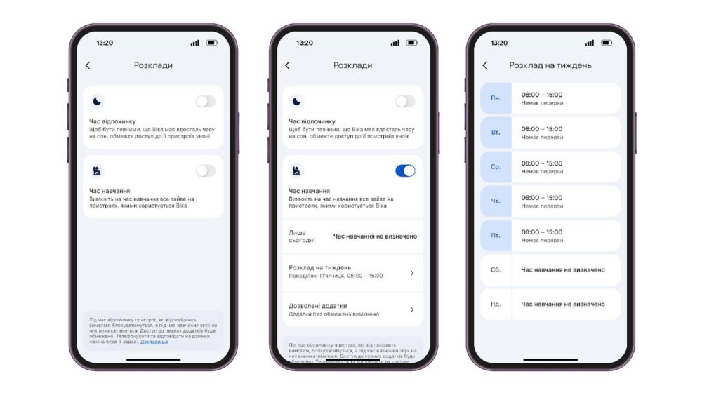 «Час навчання» дозволяє налаштувати обмежену кількість функцій та додатків, до яких дитина матиме доступ під час шкільних занять. Всі інші протягом цього часу будуть вимкнені.