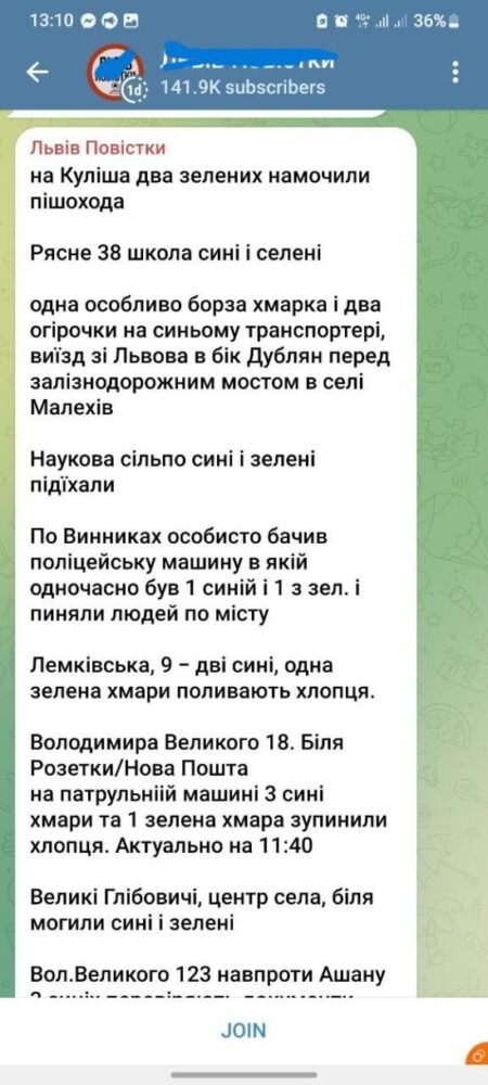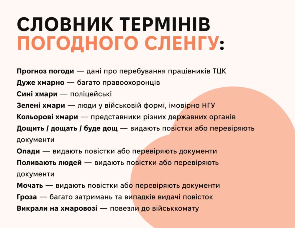 Й насправді цей сленг орієнтується навколо всього, що стосується погоди. «Сині хмари», «дощить», «поливають» разом із інформацією про конкретне місце так званої зливи – це все стосується нібито актуальних даних про місця, де бачили, як вручають повістки.