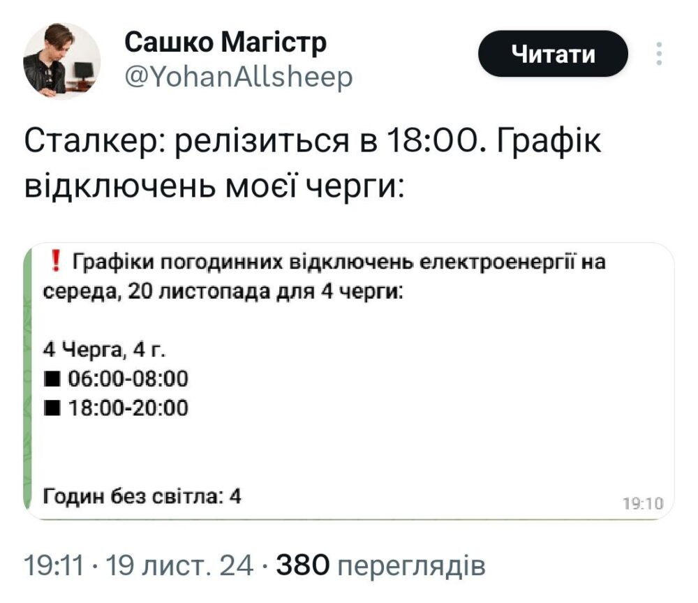 Не забули гравці й про графіки відключень світла, які для багатьох припадають якраз на годину запуску: