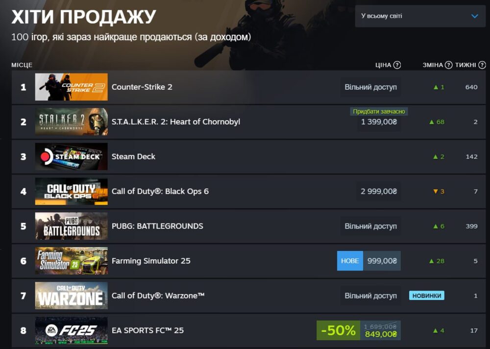 Українська гра тримається у топі вже другий тиждень, випереджаючи Call of Duty Black Ops 6, футбольний симулятор EA SPORTS FC, та безоплатні Call of Duty: Warzone, PUBG та Dota 2.