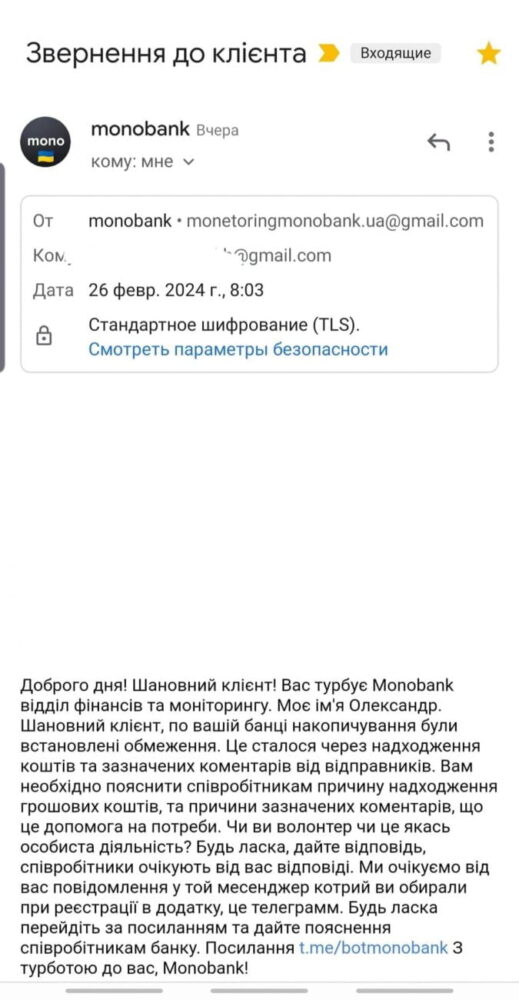 Офіційний фінансовий моніторинг монобанк проводить з електронної адреси — finmonitoring@monobank.ua.